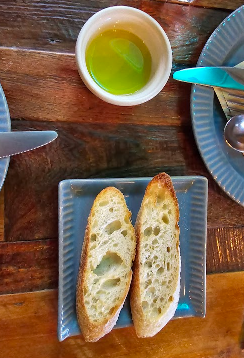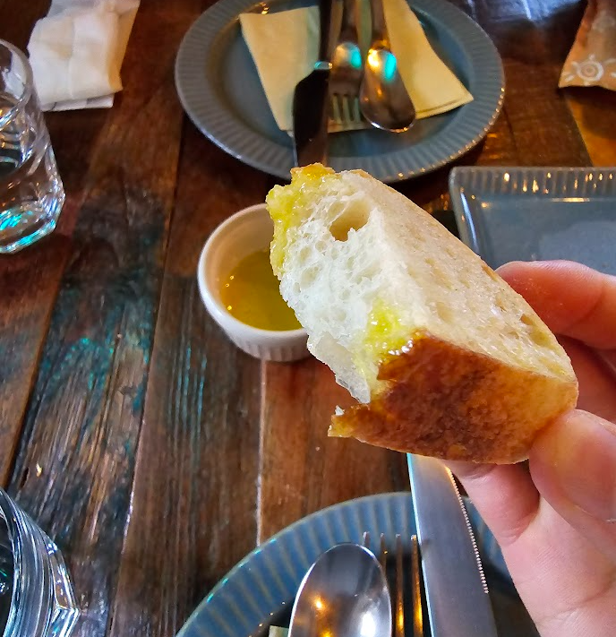 감성봇: 식전빵은 뜨끈뜨끈하니 맛있었다! 근데 뭔가 올리브유에서 케일즙 향이 나는...?