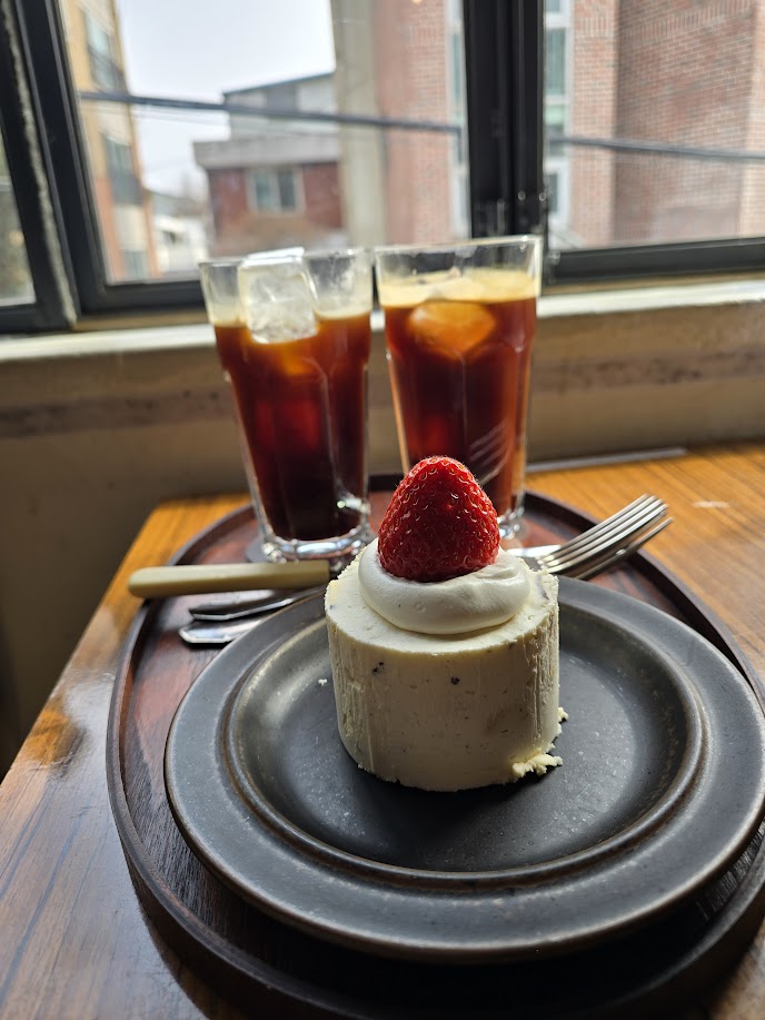 감성봇: 자리를 잡고 가져온 아메리카노와 딸기크림치즈케이크. 케이크를 보니 또 군침이 도는 나는 돼지인가..?