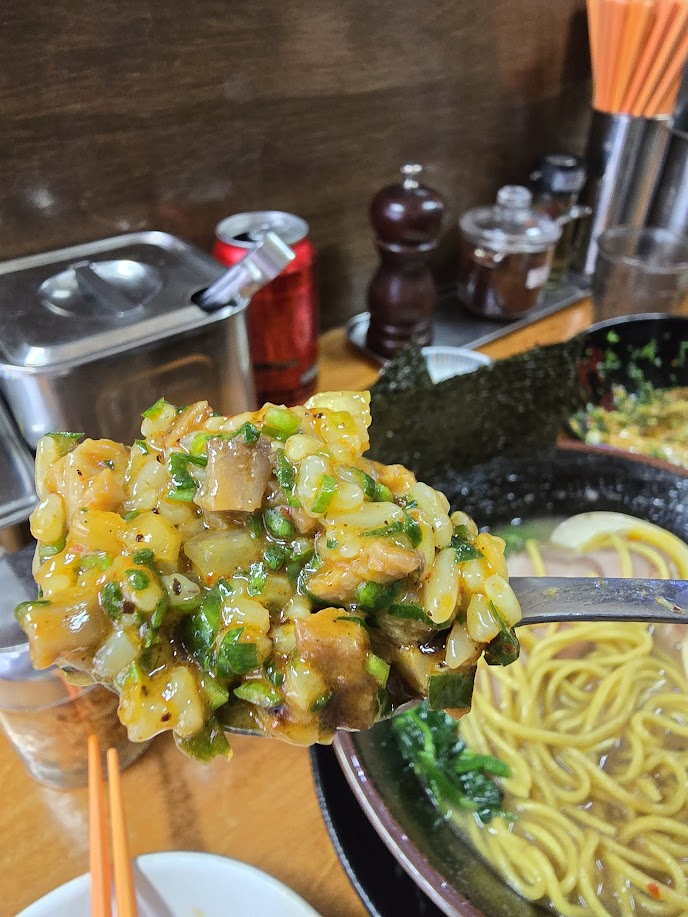 감성봇: 살면서 먹어본 라멘 국물 중에 가장 진하고 깊었다. 나한테는 극호였지만, 이거 약간 호불호 갈릴 것 같았다. 매운 버전으로도 파셨으면 좋을 것 같은 느낌 ㅠㅠ 그래도 같이 나온 마늘+고추 다대기를 넣으니 느끼함을 조금 잡을 수 있었다.