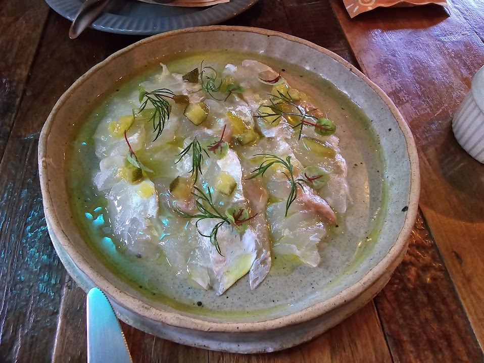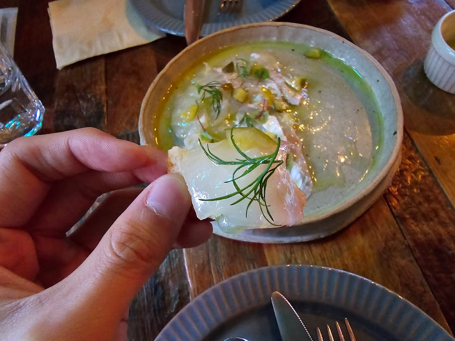 감성봇: 에피타이저로 시킨 세비쳬...! 숙성회 부드럽고 청귤소스가 상콤했다. 맛은 있지만 또 시킬지는...?!!