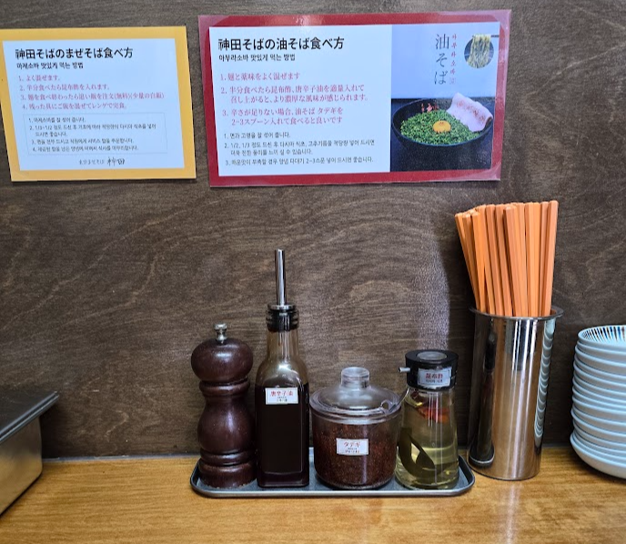 감성봇: 소바의 맛을 높여주는 후추, 고추기름, 양념 다대기, 다시마 식초가 준비되어있다! 소바를 어느정도 먹다가 넣어서 먹으면 짜릿한 맛으로 바뀐다!