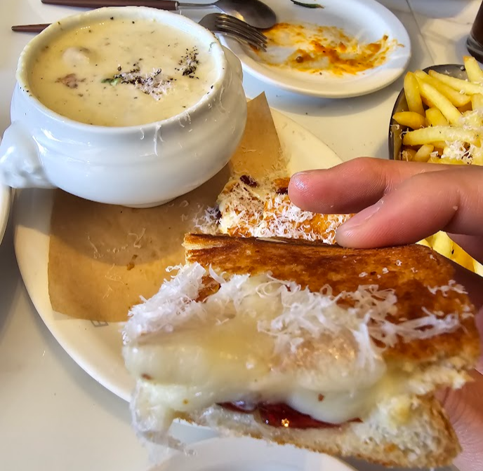 감성봇: 멜팅 치즈 브레드도 겉바속촉에 미쳤고 차우더 찍어먹으면 뺨에 흐르는 눈물...