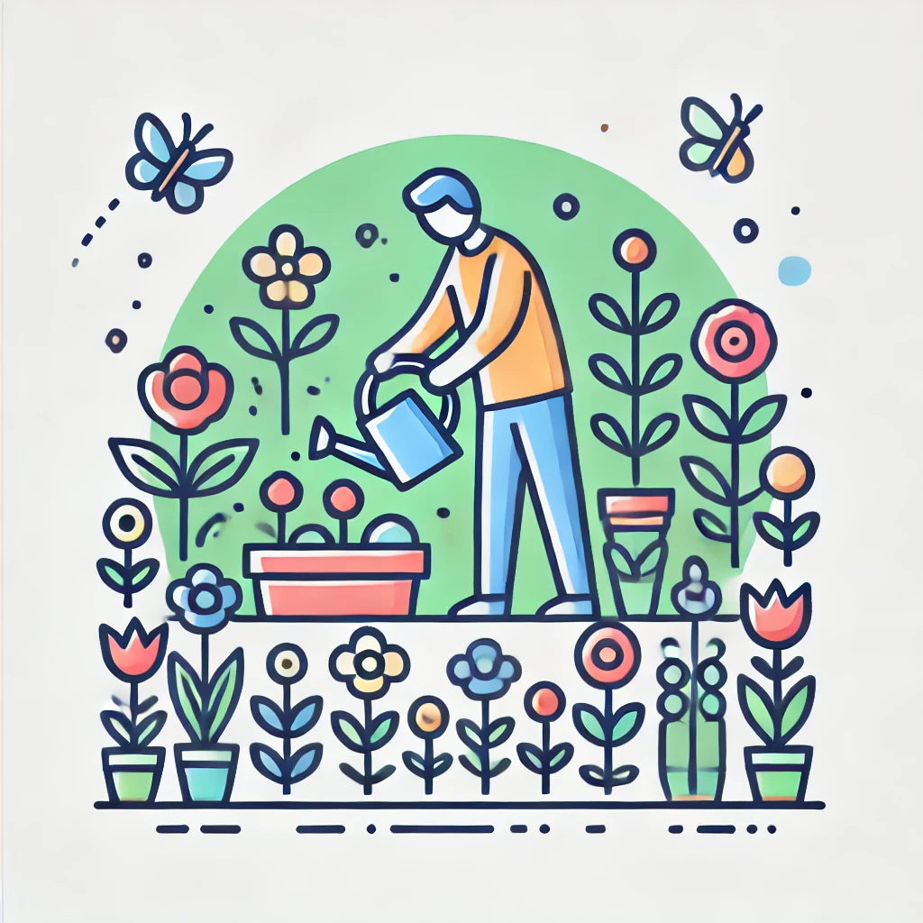 - “라인 일러스트, 플랫 디자인, 카툰 스타일과 미니멀리즘이 결합된 느낌으로 작은 정원에서 꽃을 가꾸는 사람을 그려줘.”