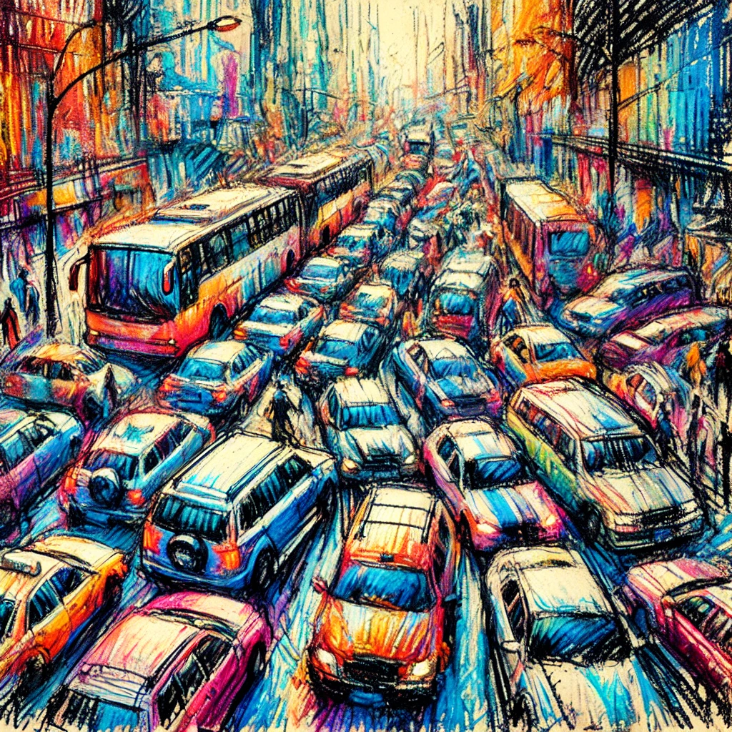 입력 Prompt: "Style Transfer를 이용해서 그림을 생성해줘. 1. 주제: 퇴근 길 교통 혼잡 2. 스타일: 표현주의 (예: 뭉크의 절규)"