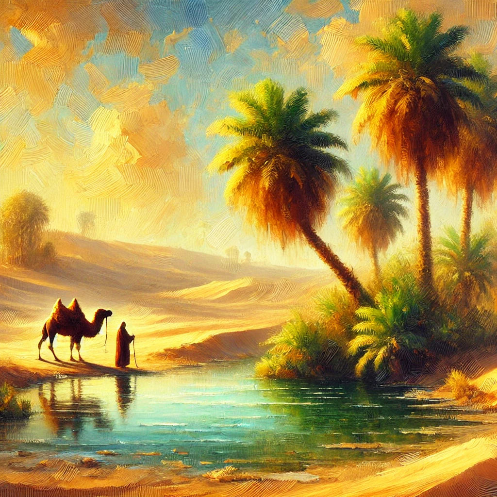 입력 Prompt: "Style Transfer를 이용해서 그림을 생성해줘. 1. 주제: 사막에서 오아시스를 발견한 낙타와 여행자 2. 스타일: 인상파 스타일"