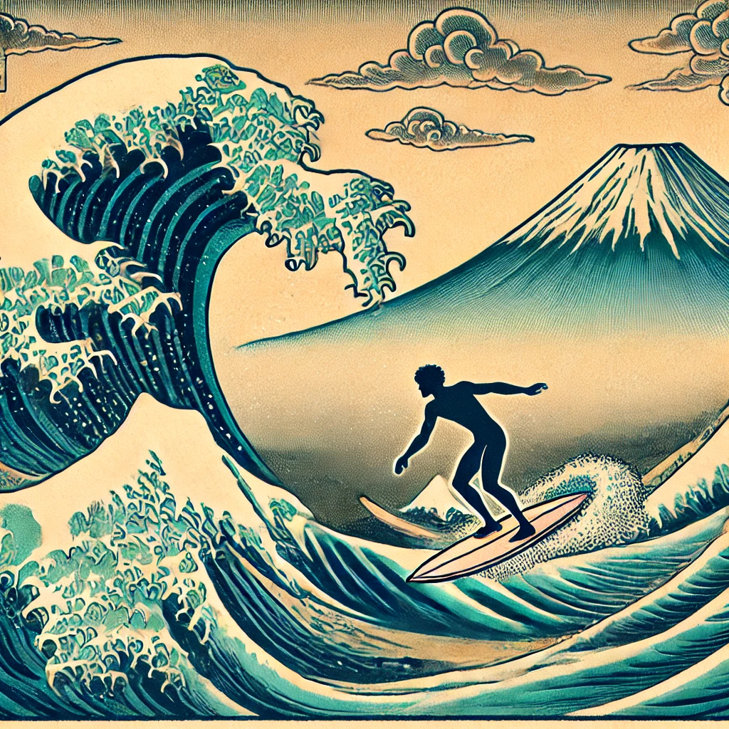 입력 Prompt: "Style Transfer를 이용해서 그림을 생성해줘. 1. 주제: 파도 위에서 서핑을 즐기는 사람 2. 스타일: 후지산을 배경으로 한 가쓰시카 호쿠사이의 목판화"