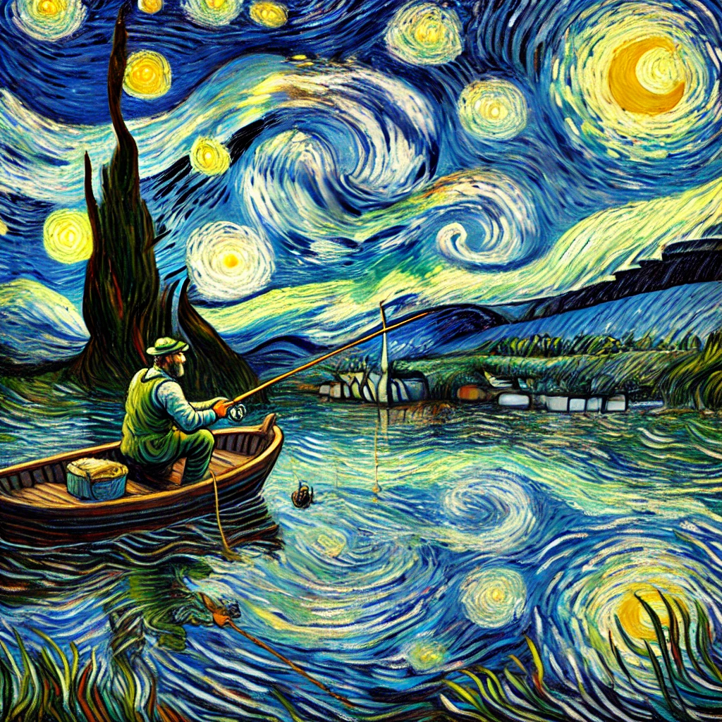 입력 Prompt: "Style Transfer를 이용해서 그림을 생성해줘. 1. 주제: 호수에서 낚시를 하는 남자 2. 스타일: 인상주의 (예: 빈센트 반 고흐의 별이 빛나는 밤)"