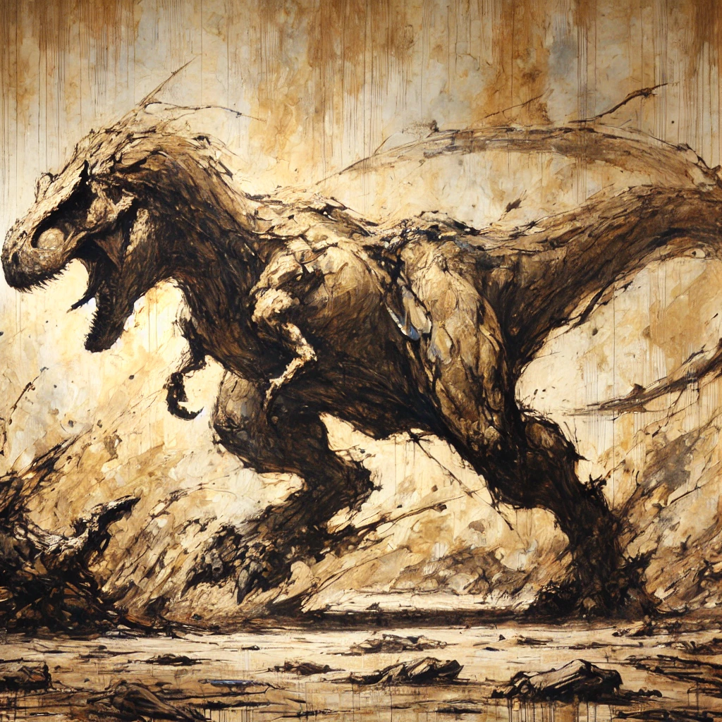 입력 Prompt: "Style Transfer를 이용해서 그림을 생성해줘. 1. 주제: 쥬라기 공원의 공룡 2. 스타일: 이중섭 화풍 (예: 황소)"