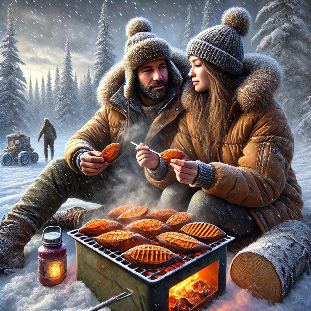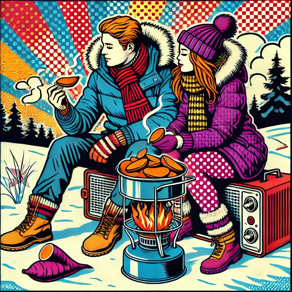 A couple enjoying roasted sweet potatoes in winter.