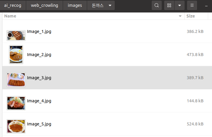 예를 들어, 이미지 검색어로 "돈까스"를 입력하고 다운로드할 이미지 개수로 5을 입력하면 "images" 디렉토리에 "돈까스" 키워드로 검색한 5개의 돈까스 이미지가 다운로드됩니다.